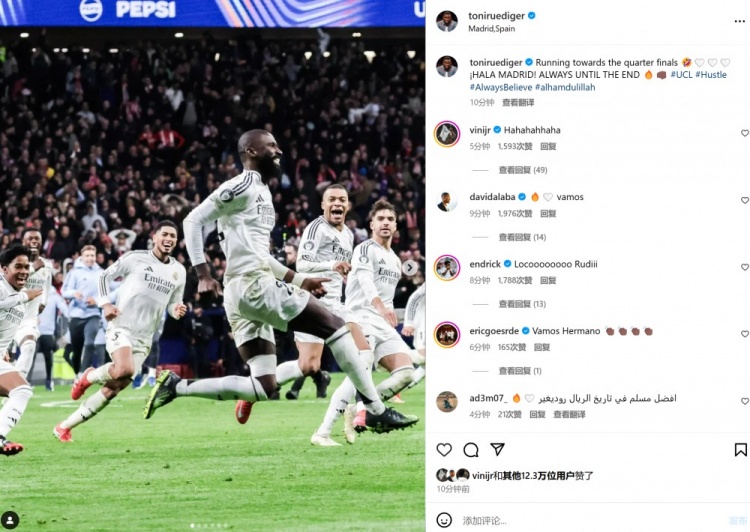 本場(chǎng)比賽呂迪格打進(jìn)致勝點(diǎn)球,賽后他也在個(gè)人社媒曬出全隊(duì)瘋狂慶祝照,配文寫(xiě)道:“沖向歐冠8強(qiáng),Hala Madrid,永遠(yuǎn)堅(jiān)持到最后一刻!”