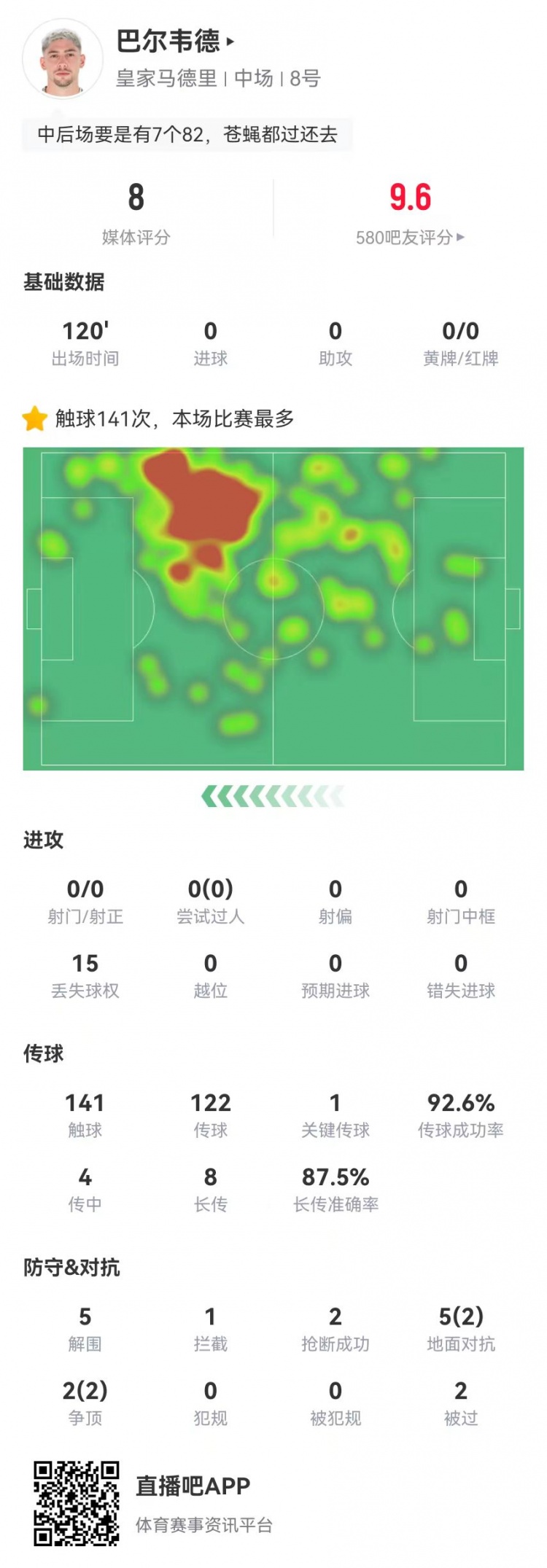 巴爾韋德本場(chǎng)5解圍2搶斷2被過(guò) 8長(zhǎng)傳7成功+1點(diǎn)球大戰(zhàn)進(jìn)球 獲8.0分