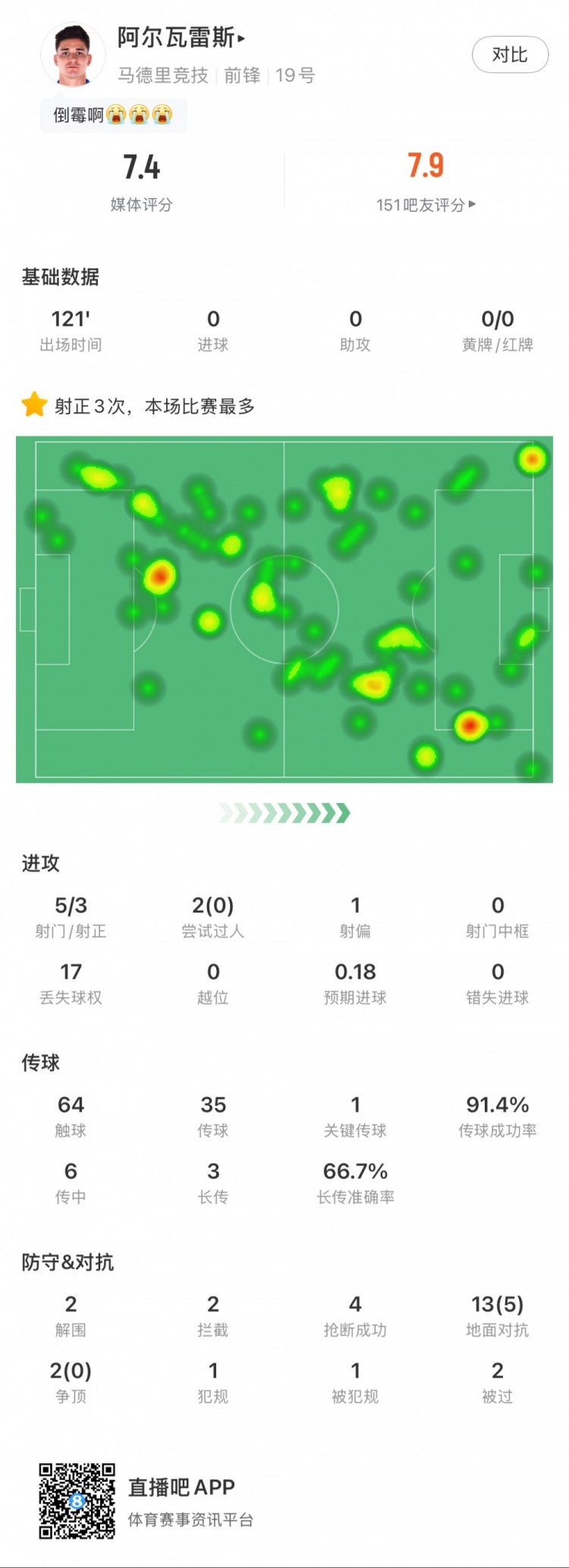 3月13日訊 歐冠1/8決賽次回合,皇馬經(jīng)過(guò)點(diǎn)球大戰(zhàn)淘汰馬競(jìng)。阿爾瓦雷斯本場(chǎng)數(shù)據(jù):