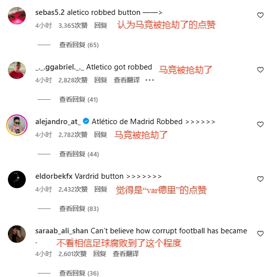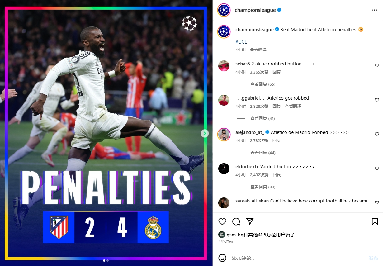 歐冠官方ins評論區(qū)被刷屏:馬競被搶劫了 足球竟腐敗到這個地步