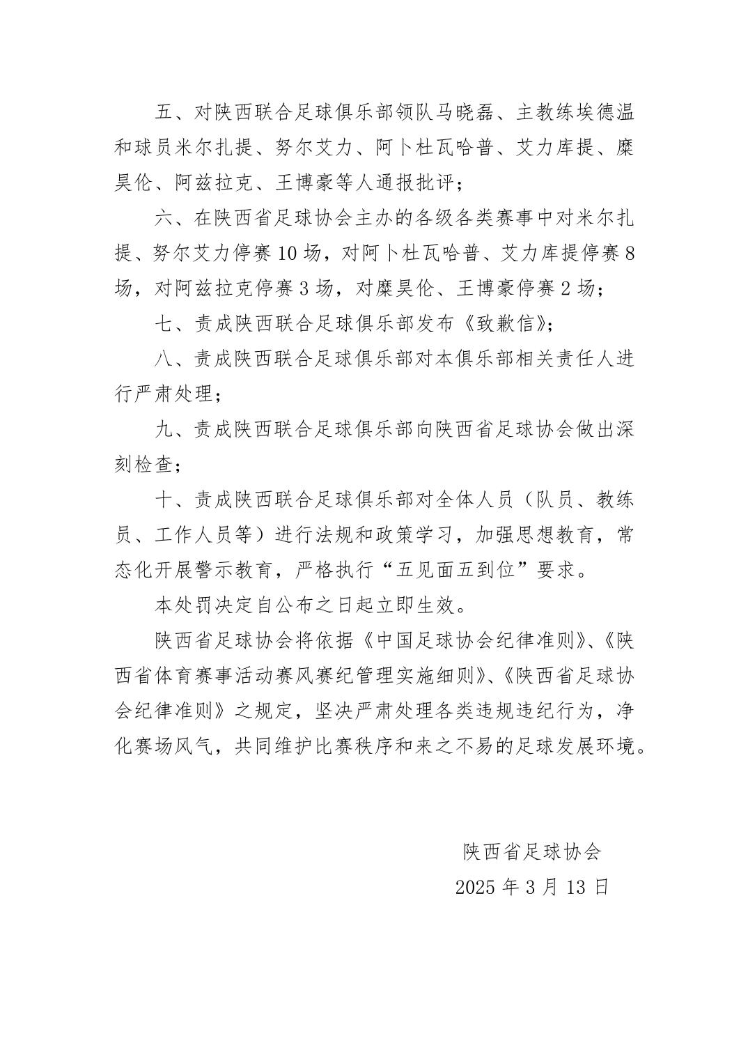 8、責成陜西聯(lián)合足球俱樂部對本俱樂部相關(guān)責任人進行嚴肅處理。