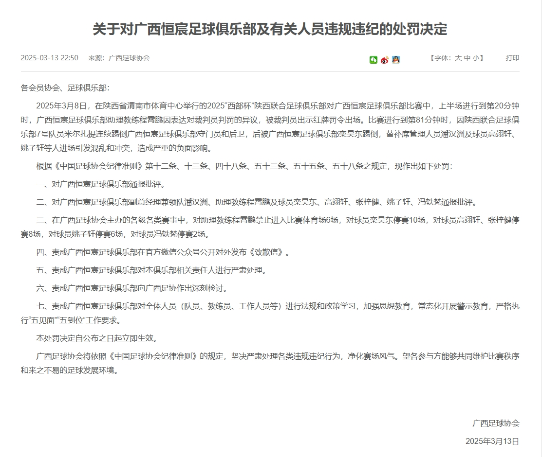 廣西恒宸官方:西部杯沖突兩相關(guān)球員三停罰2萬,主帥等三人罰1萬