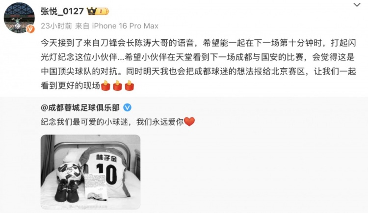 昨天,成都蓉城官方發(fā)布訃告,小球迷林子金不幸去世。張悅在社媒悼念寫道:
