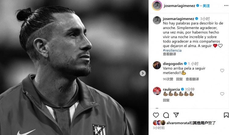 3月13日訊 在本輪歐冠,馬競在點球大戰(zhàn)不敵皇馬,無緣八強。馬競后衛(wèi)吉梅內(nèi)斯更新社媒感慨比賽。