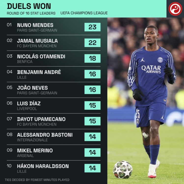 3月13日訊 歐冠16強(qiáng)戰(zhàn)已經(jīng)塵埃落定,squakwa也統(tǒng)計(jì)了本輪的成功對(duì)抗情況,努諾-門德斯力壓穆西亞拉居首。