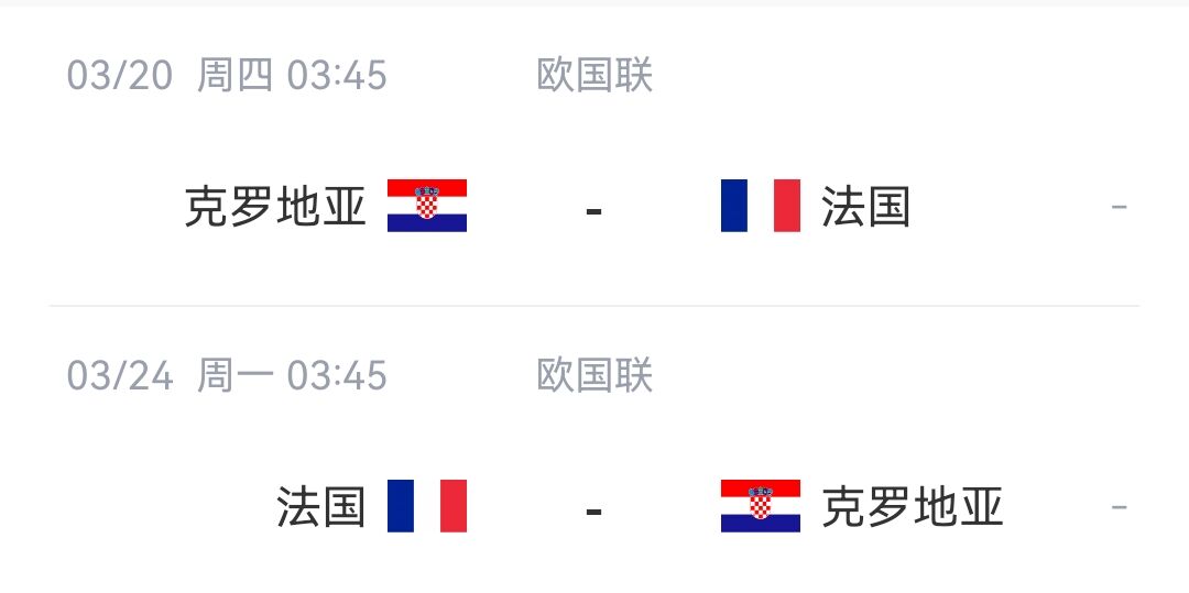 此前的歐國聯(lián)小組,法國隊(duì)力壓意大利、比利時(shí)和以色列以小組第一晉級淘汰賽,在1/4決賽中,他們要面對的是克羅地亞隊(duì)。法國與克羅地亞將在北京時(shí)間3月20日和3月24日凌晨進(jìn)行兩回合主客場的交鋒。