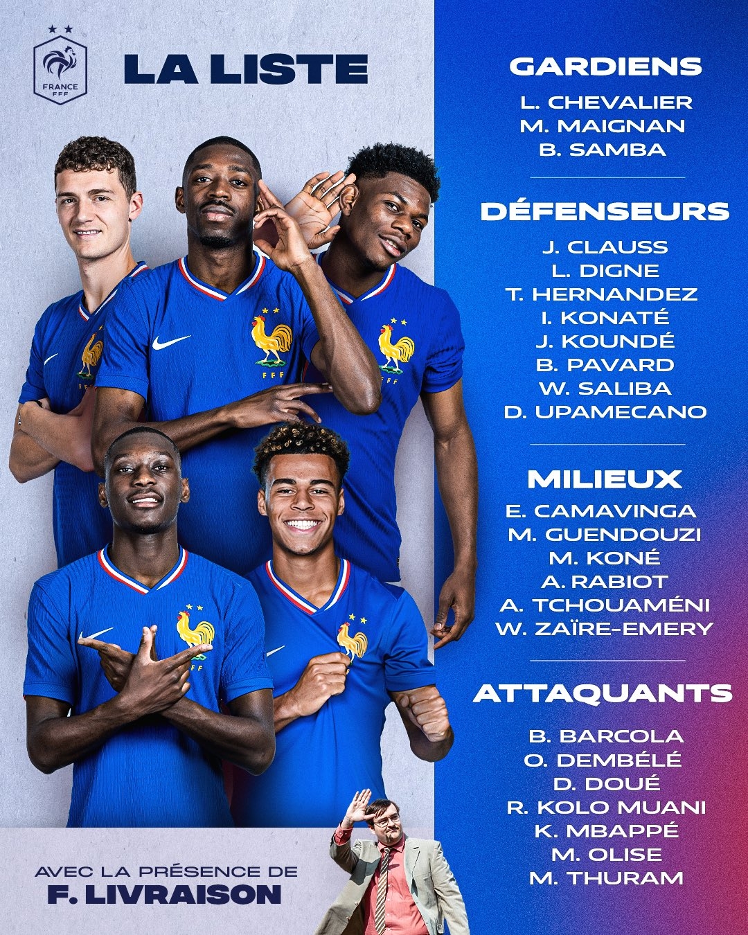 前鋒:巴爾科拉(巴黎)、登貝萊(巴黎)、杜埃(巴黎)、穆阿尼(尤文)、姆巴佩(皇馬)、奧利塞(拜仁)、小圖拉姆(國際米蘭)