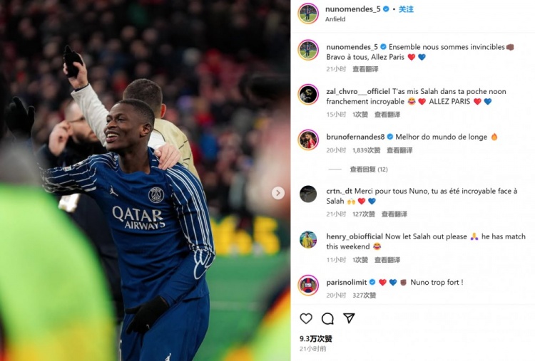 同薩拉赫對(duì)位的巴黎邊后衛(wèi)努諾-門德斯堪稱晉級(jí)的隱形功臣,他也在賽后通過(guò)社媒曬照慶祝:“團(tuán)結(jié)起來(lái)的我們是無(wú)敵的!大家做得很棒,巴黎加油!”