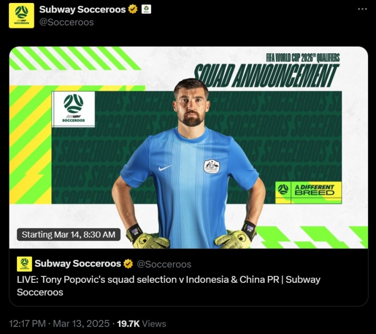 將戰(zhàn)國(guó)足!官方:澳大利亞新一期名單明日上午8:30公布