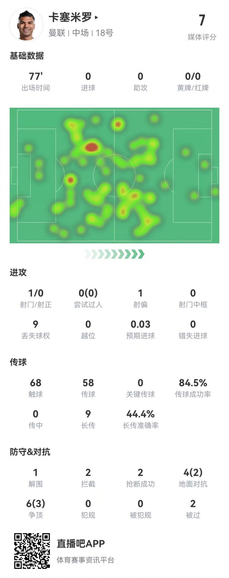 卡塞米羅本場(chǎng)11對(duì)抗6成功 3搶斷2攔截+4成功長(zhǎng)傳 獲評(píng)7.0分
