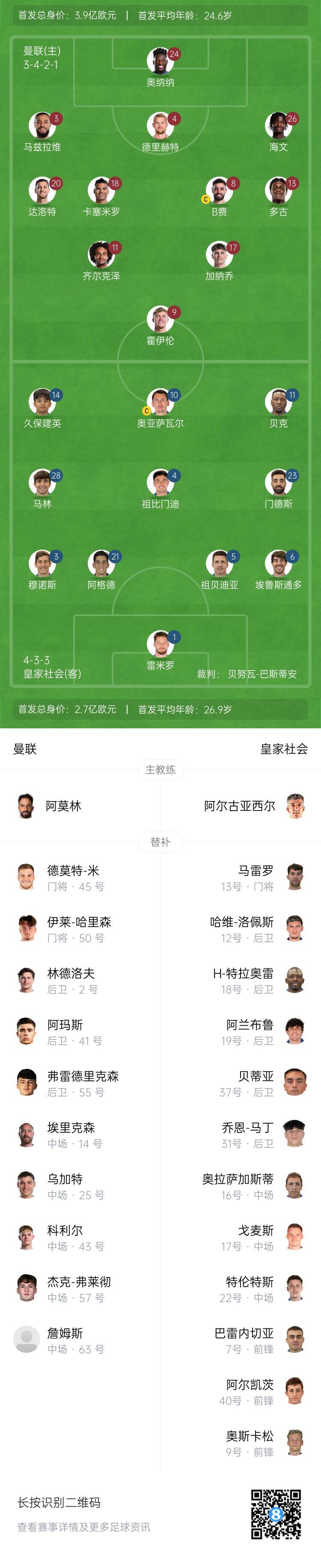 曼聯(lián)首發(fā):24-奧納納、3-馬茲拉維、4-德利赫特、26-海文、20-達(dá)洛特、18-卡塞米羅、8-B費、13-多古、17-加納喬、11-齊爾克澤、9-霍伊倫