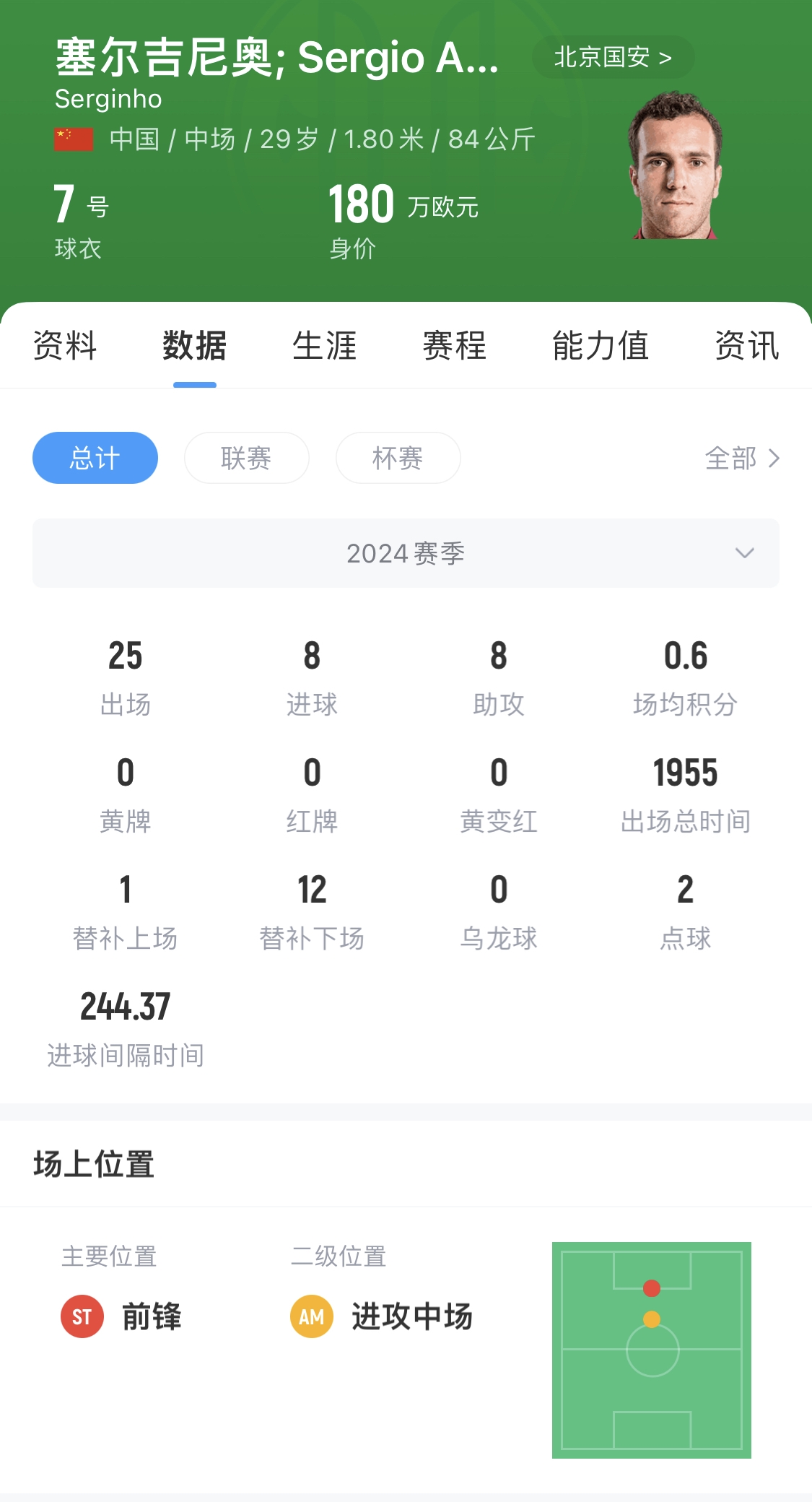 1995年3月15日出生的塞爾吉尼奧原來擁有巴西和意大利雙重國籍,2020年1月加盟長春亞泰,代表球隊(duì)出戰(zhàn)100場打進(jìn)30個進(jìn)球,完成23次助攻。2025賽季以40萬歐元的身價轉(zhuǎn)會至北京國安。轉(zhuǎn)換會籍成功的第二天,塞爾吉尼奧也將迎來自己的30歲生日。