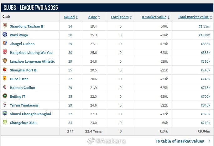 中乙球隊身價更新:山東泰山B隊以135萬歐元排在第一