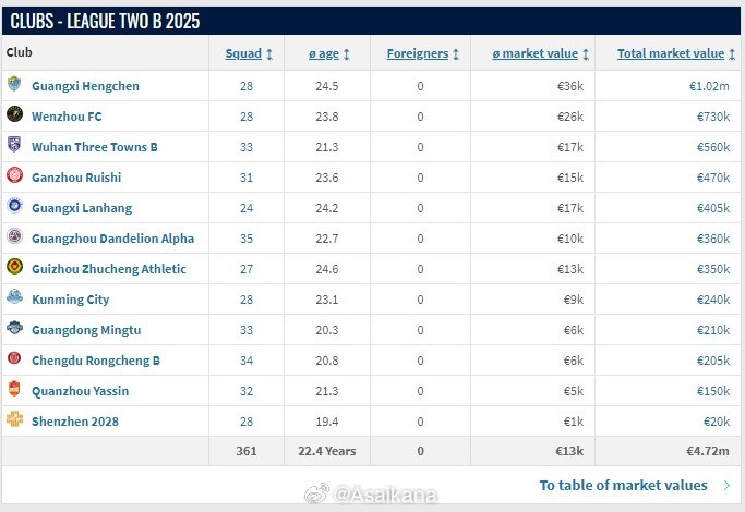 2025賽季中乙各隊名單已在轉會市場網(wǎng)更新。球隊總身價方面,山東泰山B隊以135萬歐元列第一,后面依次是無錫吳鉤(108萬歐)、廣西恒宸(102萬歐)、江西廬山(83.5萬歐)、杭州臨平吳越(83.5萬歐)、蘭州隴原競技(81萬歐)、上海海港B隊(74.5萬歐)、湖北青年星(74.5萬歐)、溫州(73萬歐)、南通海門珂締緣(71.5萬歐)、北京理工(70萬歐)、泰安天貺(64.5萬歐)、武漢三鎮(zhèn)B隊(56萬歐)、贛州瑞獅(47萬歐)、廣西藍航(40.5萬歐)、山西崇德榮海(37萬歐)、廣州蒲公英(36萬歐)、貴州筑城競技(35萬歐)、昆明城市(24萬歐)、廣東銘途(21萬歐)、長春喜都(21萬歐)、成都蓉城B隊(20.5萬歐)、泉州亞新(15萬歐)、深圳二零二八(2萬歐)。