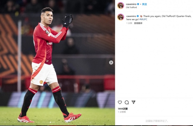 卡塞米羅也在被換下場時回報以掌聲,賽后還通過社媒曬出照片并配文:“再次感謝,老特拉福德!??!歐聯(lián)杯八強戰(zhàn),我們來了!”