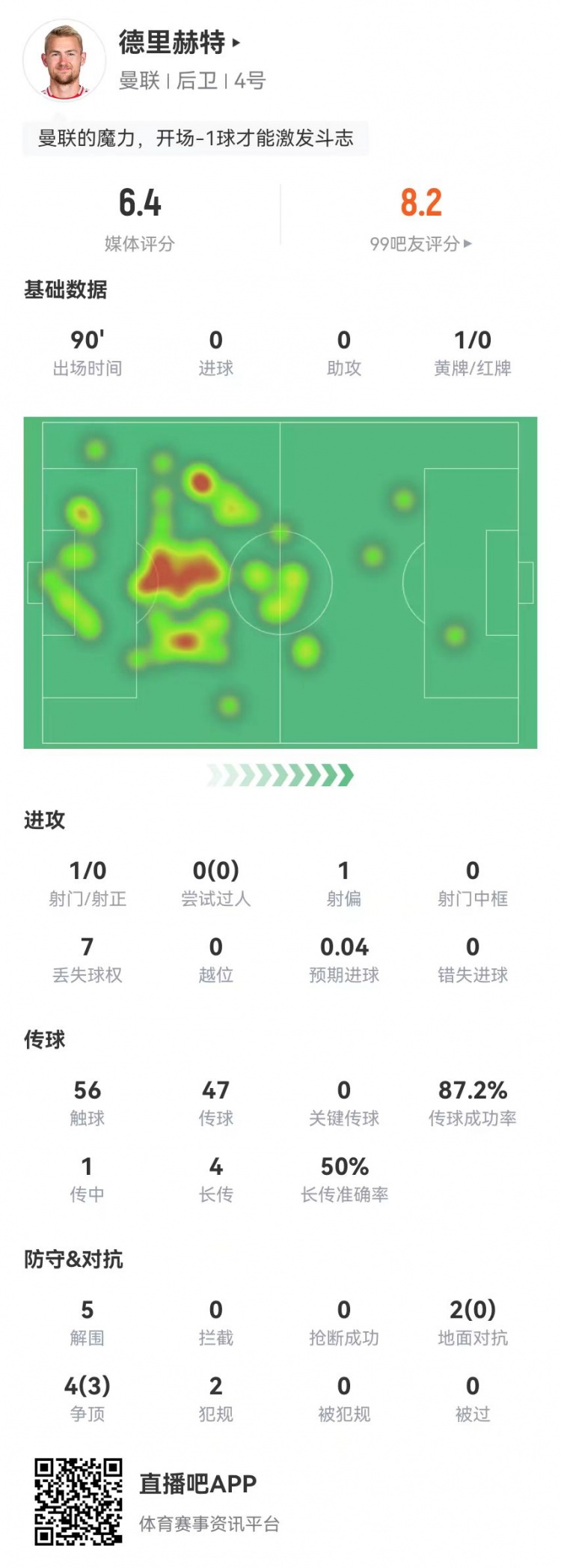 德里赫特本場5解圍1封堵1送點 6對抗3成功 獲評6.4分全隊最低