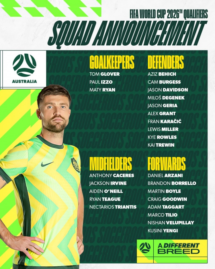 【相關(guān)】澳大利亞隊世預(yù)賽名單:“人民球王”古德溫領(lǐng)銜,3月25號對國足