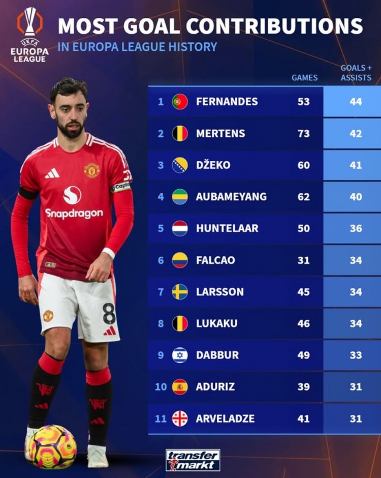 3月14日訊 曼聯(lián)在歐聯(lián)杯16強戰(zhàn)次回合4-1擊敗皇家社會,B費上演帽子戲法,數(shù)據(jù)統(tǒng)計顯示他已是歐聯(lián)歷史參與進球最多的球員。