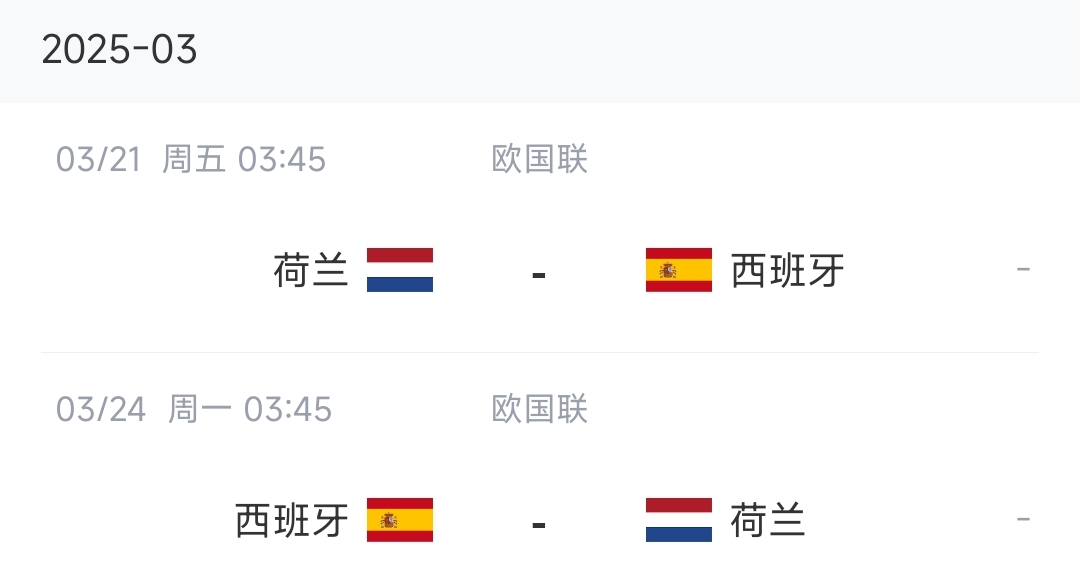 3月份國際比賽日中,西班牙將在歐國聯(lián)1/4決賽迎來與荷蘭隊的兩回合比賽,比賽時間為3月21日和3月24日,西班牙先客后主。