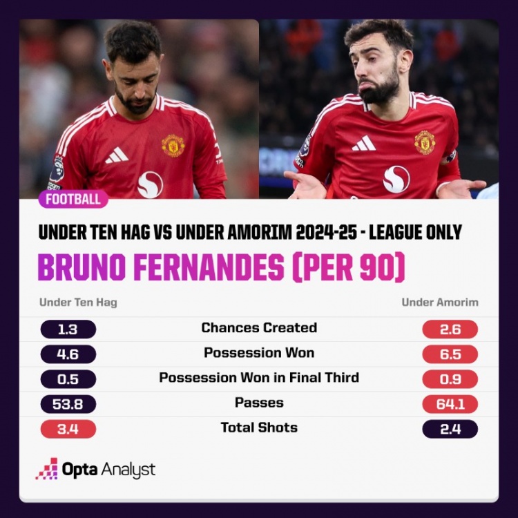 B費本賽季英超每90分鐘關(guān)鍵數(shù)據(jù):滕哈赫時代→阿莫林時代