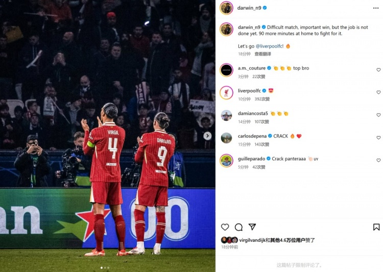 賽后努涅斯在個(gè)人社媒曬出與范迪克謝場(chǎng)照片,配文寫道:“艱難的比賽,重要的勝利,但是工作還沒有完成,主場(chǎng)還有90分鐘比賽需要拼搏?!?/p>