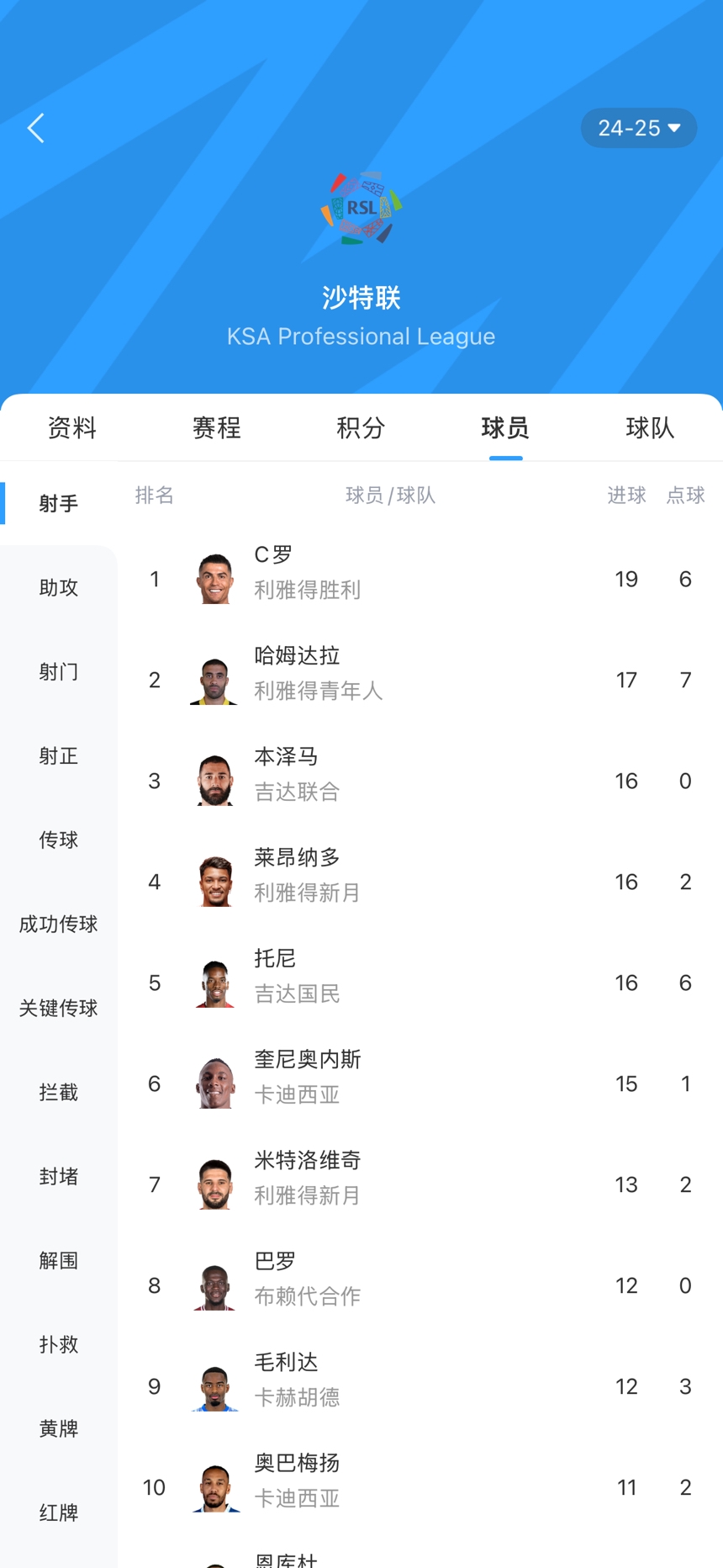 沙特聯(lián)射手榜:40歲C羅19球領(lǐng)跑,37歲本澤馬4輪球荒&16球排第三