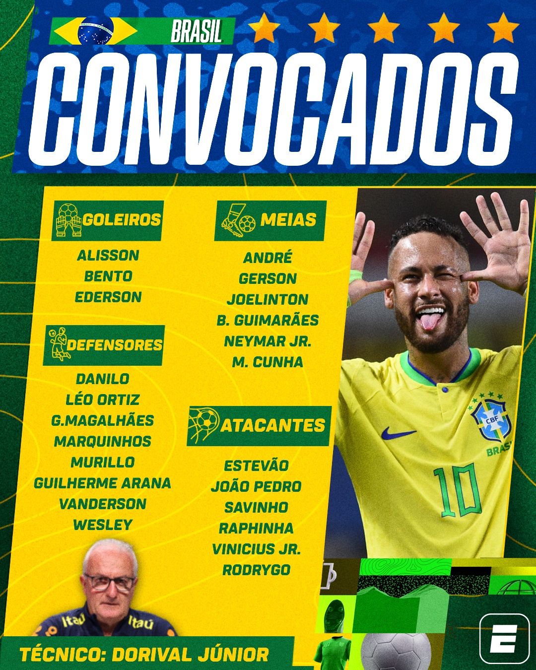 前鋒:埃斯特旺(帕爾梅拉斯)、若昂-佩德羅(布萊頓)、維尼修斯(皇馬)、羅德里戈(皇馬)、拉菲尼亞(巴薩)、薩維尼奧(曼城)