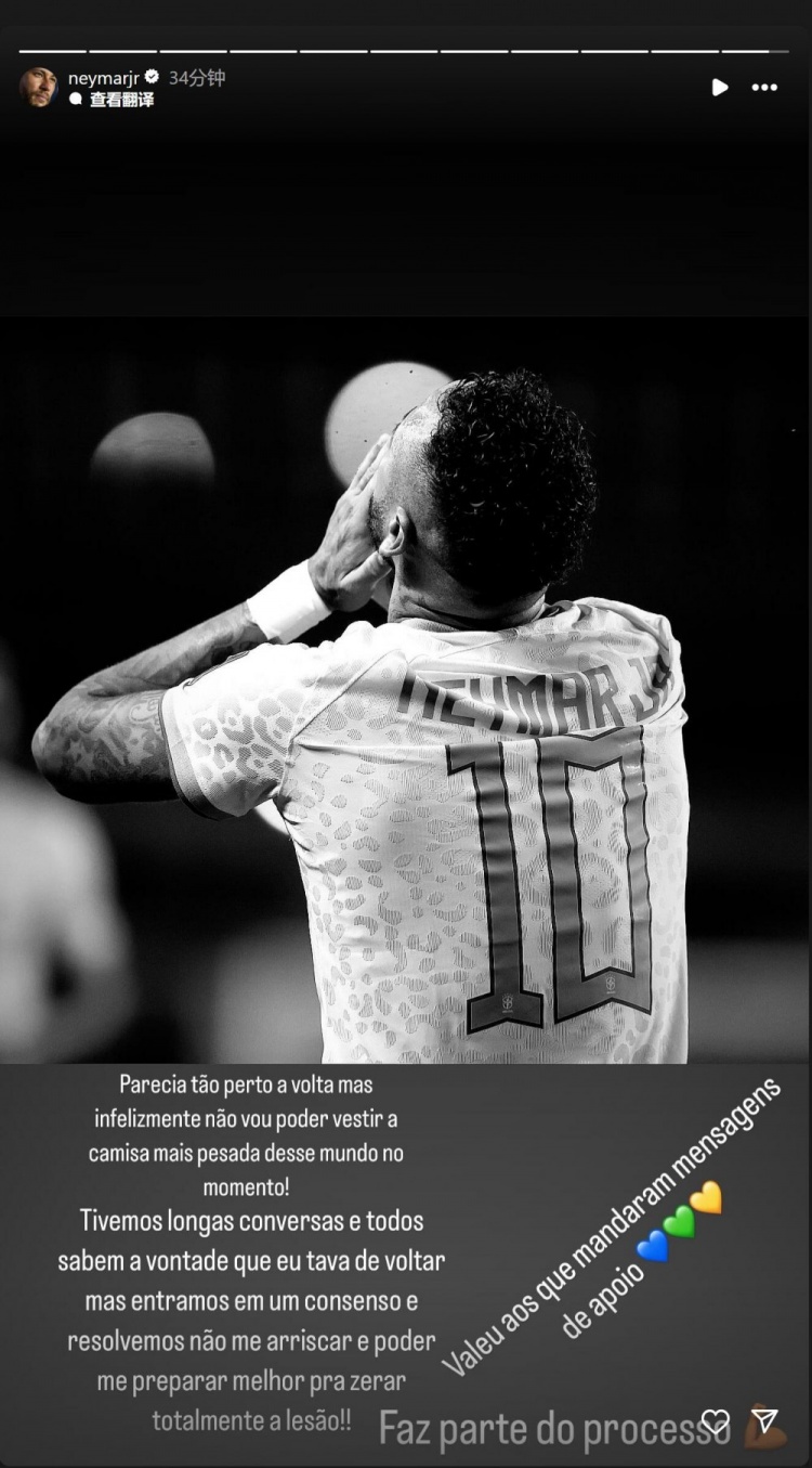 內(nèi)馬爾寫道:“看似回歸近在咫尺,但遺憾的是,目前我還無法穿上這件世界上最具分量的球衣!我們進(jìn)行了長時(shí)間的交談,大家都知道我渴望回歸的心情,但我們(在溝通后)達(dá)成了共識,決定不冒險(xiǎn),而是更好地做好準(zhǔn)備,等傷病完全痊愈!這是整個過程的一部分???”