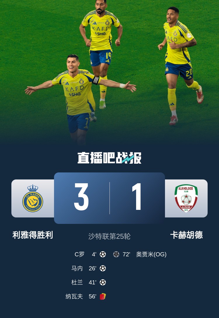 C羅破門+直塞策動(dòng),馬內(nèi)和杜蘭建功,十人利雅得勝利主場(chǎng)3-1戰(zhàn)勝卡赫胡德。