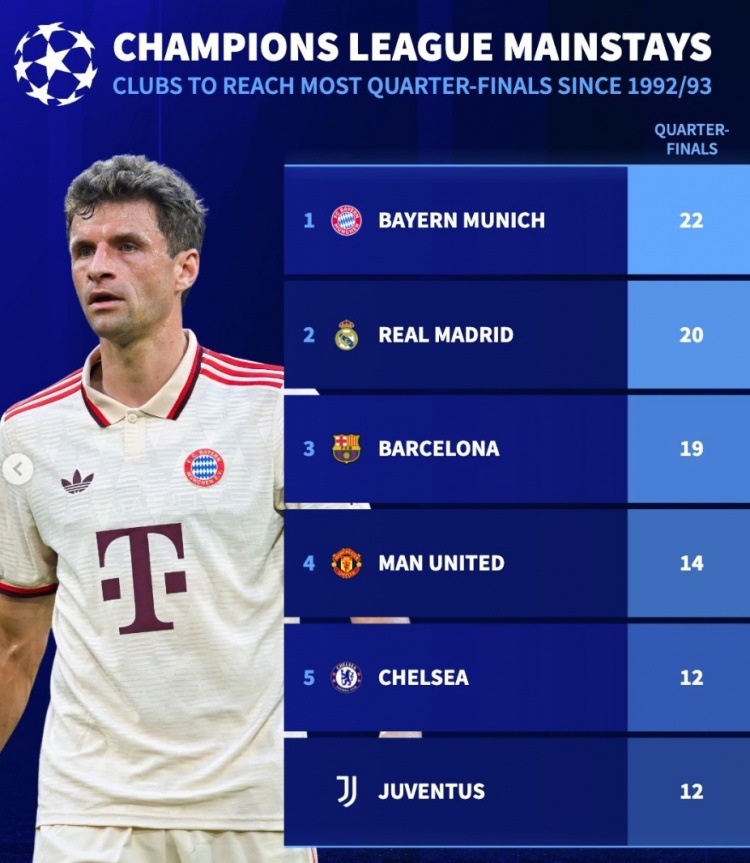 改制后晉級(jí)歐冠八強(qiáng)次數(shù)榜:拜仁22次居首,皇馬20次、巴薩19次