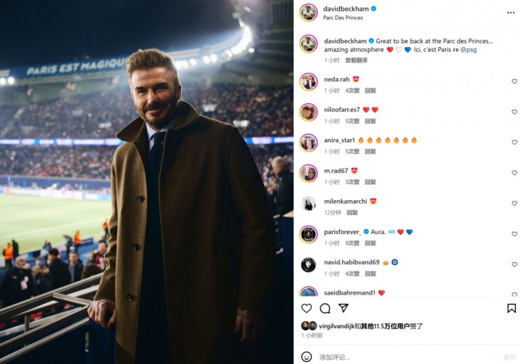 本場(chǎng)比賽前巴黎球員貝克漢姆來到現(xiàn)場(chǎng)觀戰(zhàn),賽后他也在個(gè)人社媒曬出現(xiàn)場(chǎng)看球照片,配文寫道:“很高興重回巴黎王子公園球場(chǎng),這里的氛圍太不可思議了?!?/p>