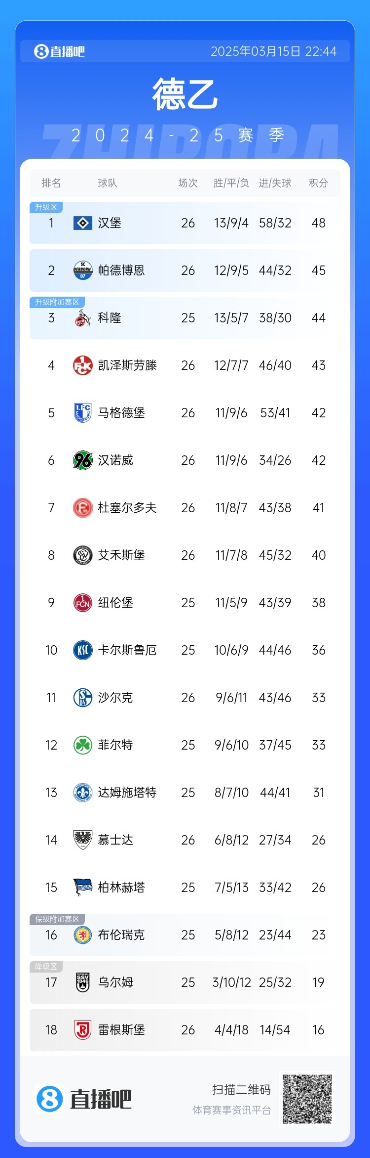 本輪過后帕德博恩反超凱澤斯勞滕升至第二位,距榜首漢堡3分。