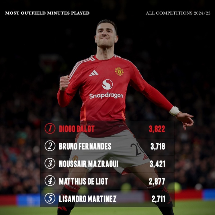 3月16日訊 曼聯(lián)官方統(tǒng)計(jì)了本賽季各項(xiàng)賽事非門將球員的出場(chǎng)時(shí)間,達(dá)洛特壓B費(fèi)居首。