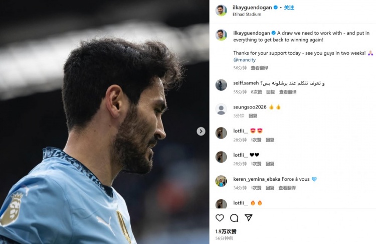 3月16日訊 曼城在本輪英超焦點戰(zhàn)2-2戰(zhàn)平布萊頓,老將京多安在賽后發(fā)文鼓勵全隊。