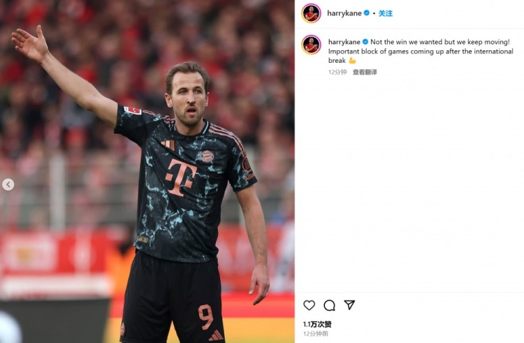 凱恩也在賽后通過社媒曬出比賽照,并表示:“沒有取得我們想要的勝利,但我們會繼續(xù)前進。在國家隊比賽周之后,還會有更重量級的比賽等著我們????”。