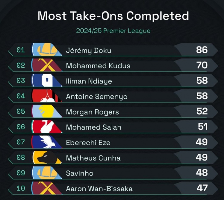 本賽季英超成功過(guò)人榜:多庫(kù)86次領(lǐng)跑,薩拉赫、薩維尼奧在列