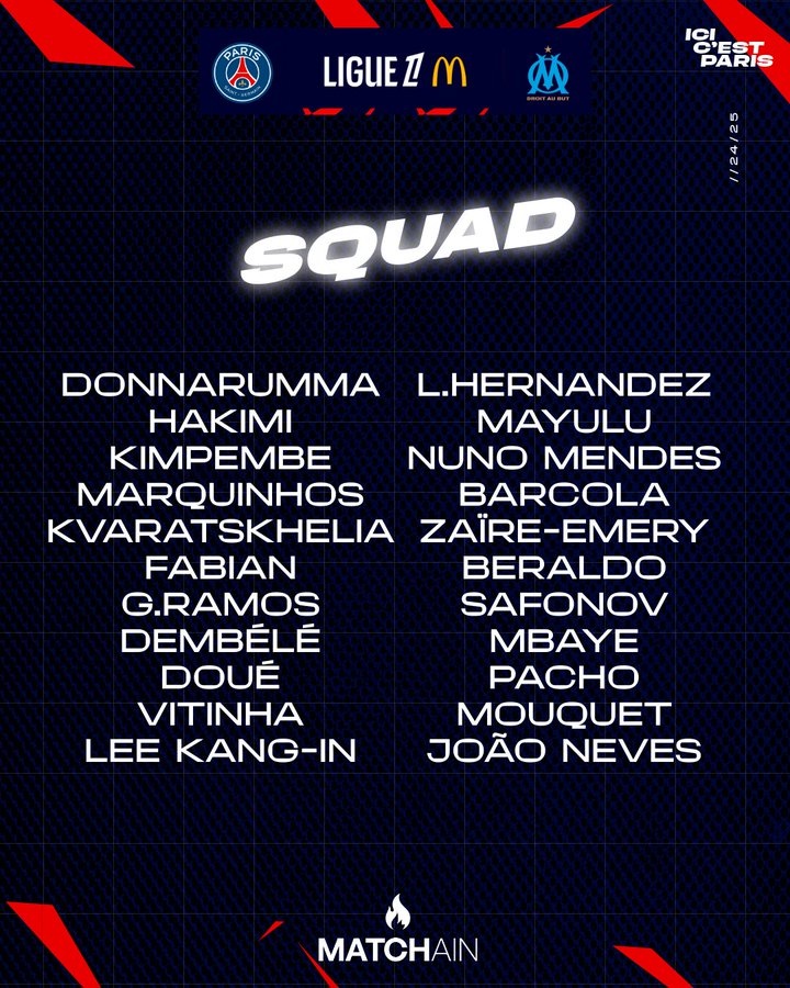 巴黎戰(zhàn)馬賽大名單:K77、登貝萊、內維斯、維蒂尼亞領銜