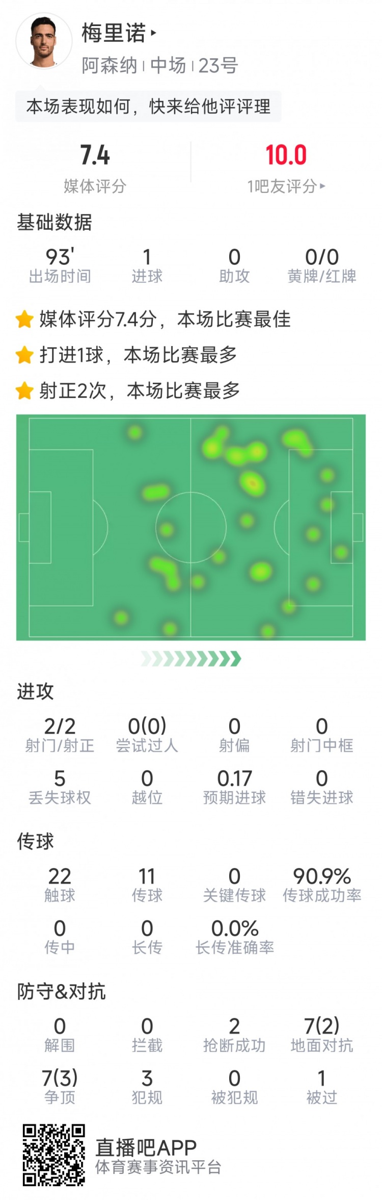 梅里諾本場(chǎng)數(shù)據(jù):打進(jìn)全場(chǎng)唯一進(jìn)球,2次射門(mén)均射正,2次搶斷