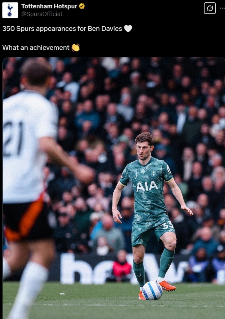 本場比賽也是本-戴維斯生涯代表熱刺各項(xiàng)賽事第350次登場,球隊(duì)官推也曬照為其紀(jì)念,配文寫道:“多么了不起的成就!”