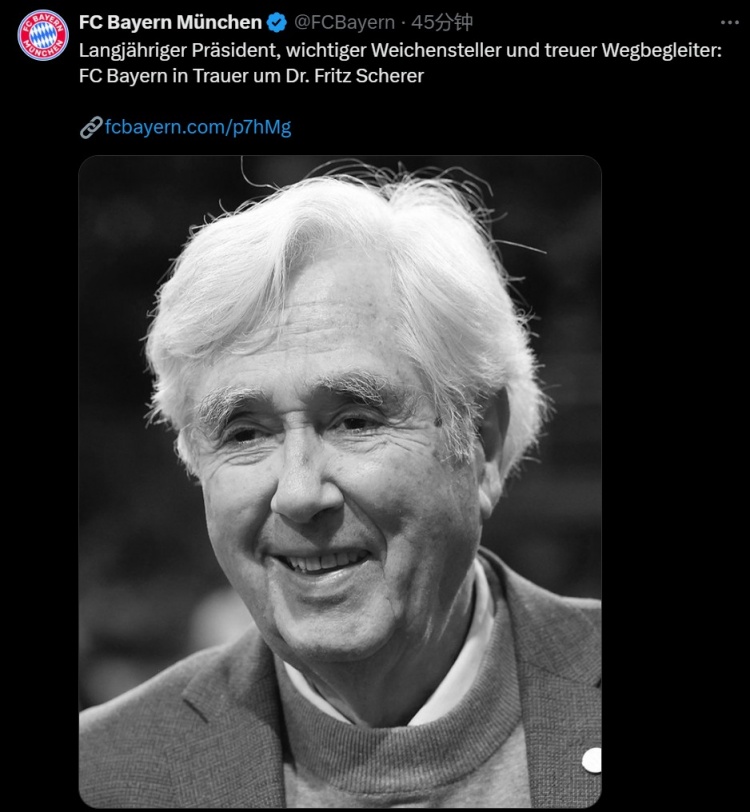 拜仁官方悼念前俱樂部主席弗里茨-舍勒去世,享年85歲