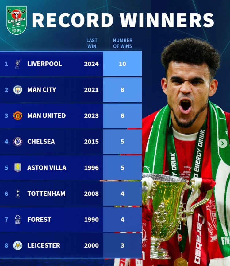 聯(lián)賽杯歷史奪冠榜:利物浦10冠居首,曼城8冠、曼聯(lián)6冠