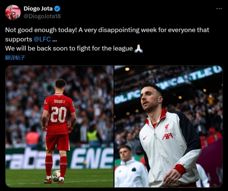 3月17日訊 利物浦在聯(lián)賽杯決賽1-2不敵紐卡,若塔在賽后通過(guò)社媒發(fā)文。