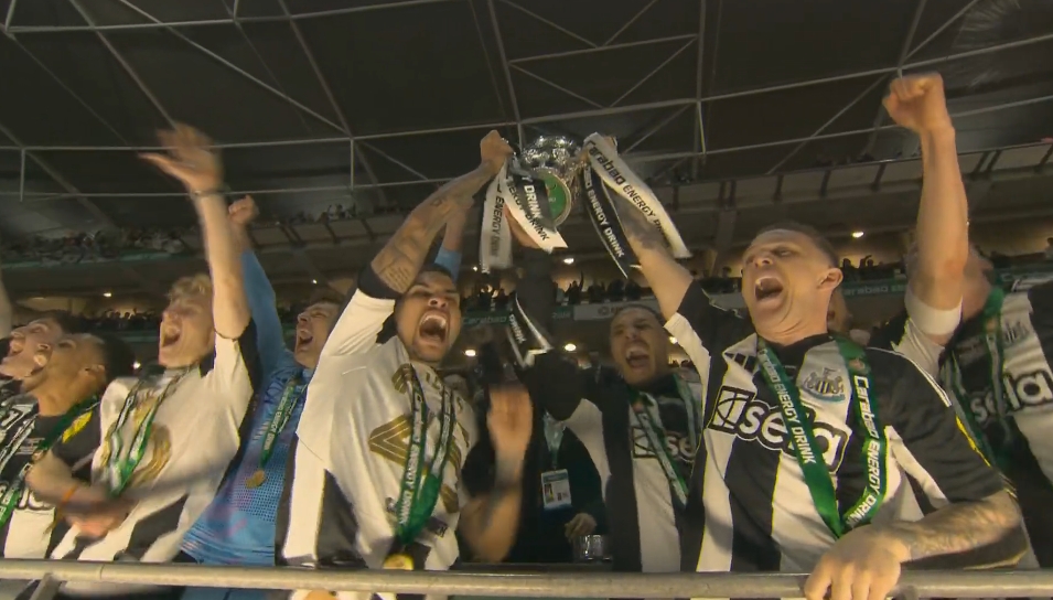03月17日訊 紐卡擊敗利物浦奪得聯(lián)賽杯獎(jiǎng)杯,終結(jié)隊(duì)史70年國(guó)內(nèi)頂級(jí)賽事冠軍荒。賽后頒獎(jiǎng)儀式,特里皮爾和吉馬良斯捧起冠軍獎(jiǎng)杯!
