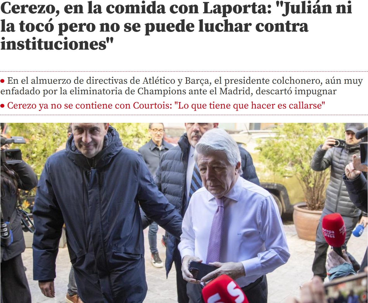 馬競(jìng)主席塞雷佐再次談到了周中歐冠阿爾瓦雷斯被判無效的點(diǎn)球,塞雷佐斬釘截鐵地表示這球應(yīng)算有效。