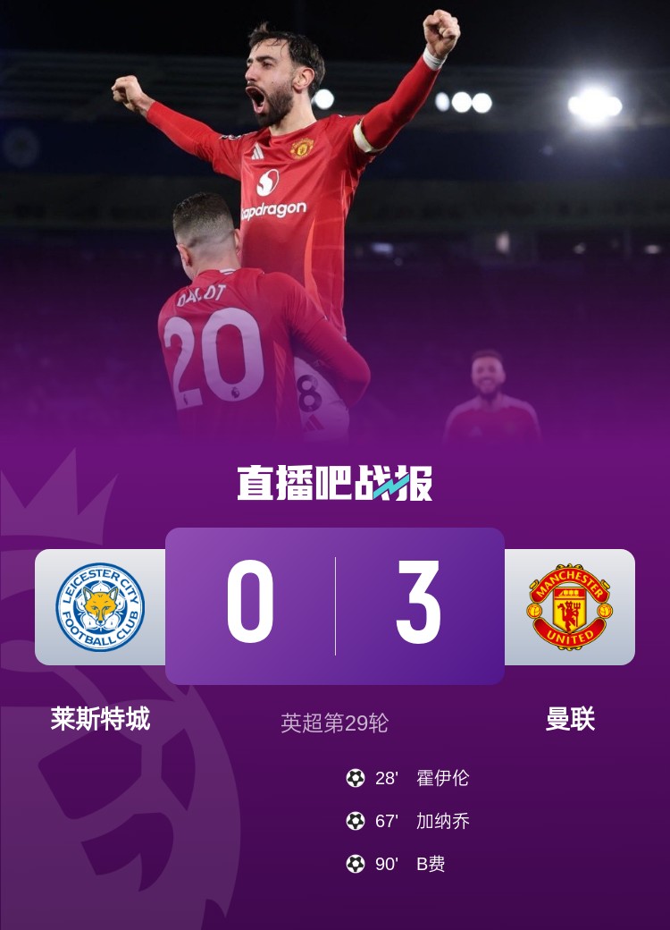 賽季4殺!曼聯(lián)3-0萊斯特 B費(fèi)1射2傳霍伊倫加納喬破門海文傷退