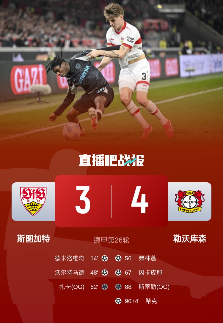 神奇劇本!勒沃庫森連追3球4-3斯圖加特落后拜仁6分 ??搜a(bǔ)時(shí)絕殺