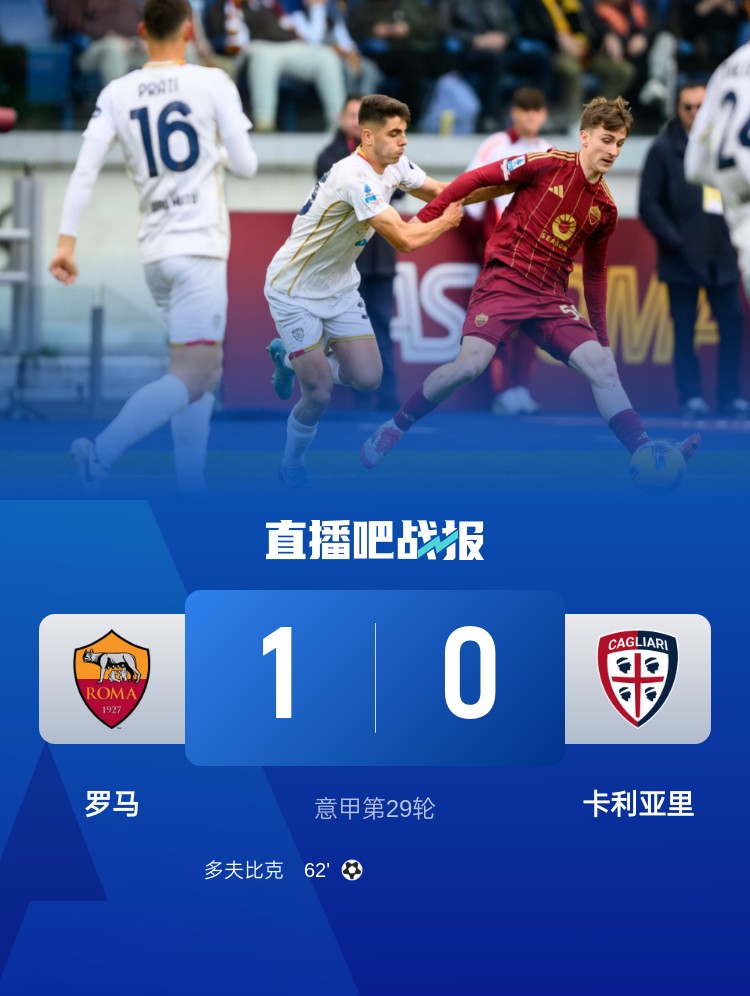 羅馬1-0擊敗卡利亞里,豪取聯(lián)賽六連勝,積分榜上超越AC米蘭,升至第七位。
