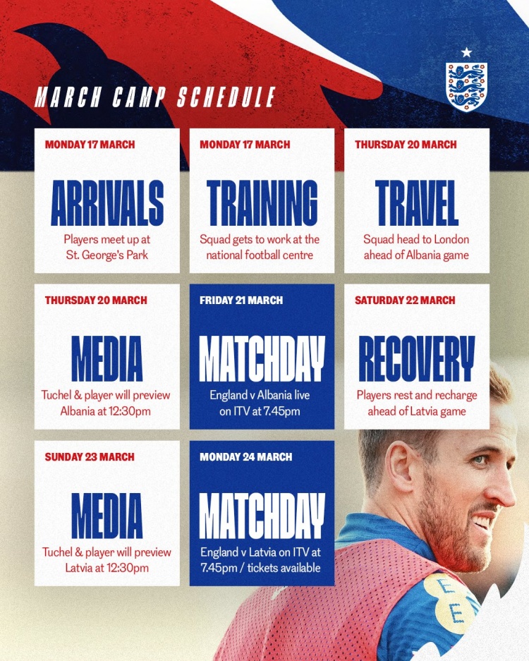 英格蘭本期集訓(xùn)日程:3月17日集合,將對(duì)陣阿爾巴尼亞、拉脫維亞