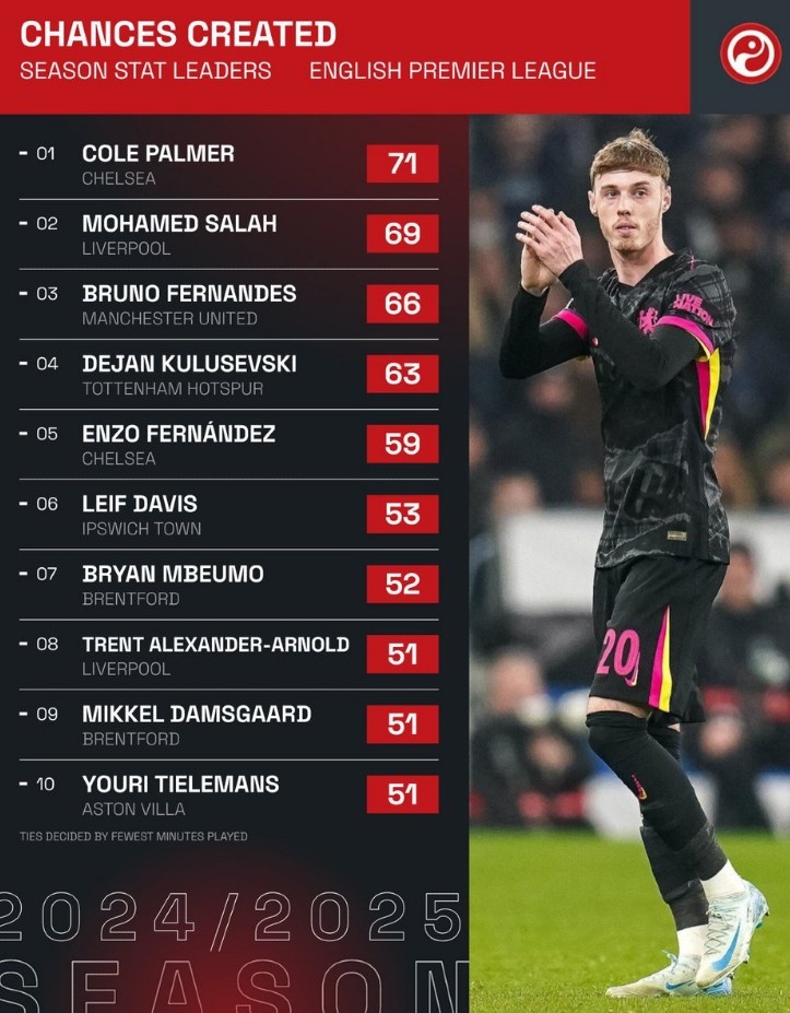 本賽季英超創(chuàng)造機會榜:帕爾默居首,薩拉赫次席,B費第三