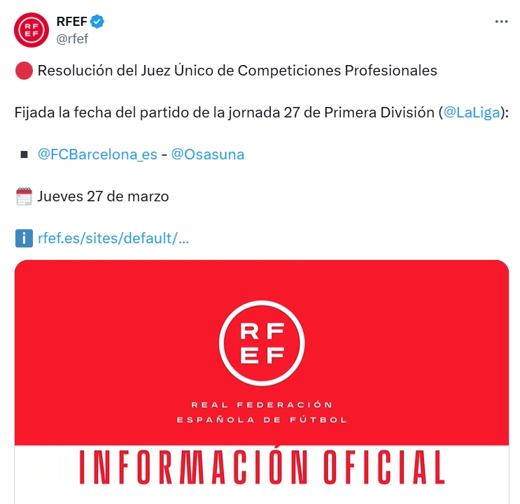 通知對象: 巴薩、奧薩蘇納、LNFP、裁判委員會、RFEF競賽部門。
